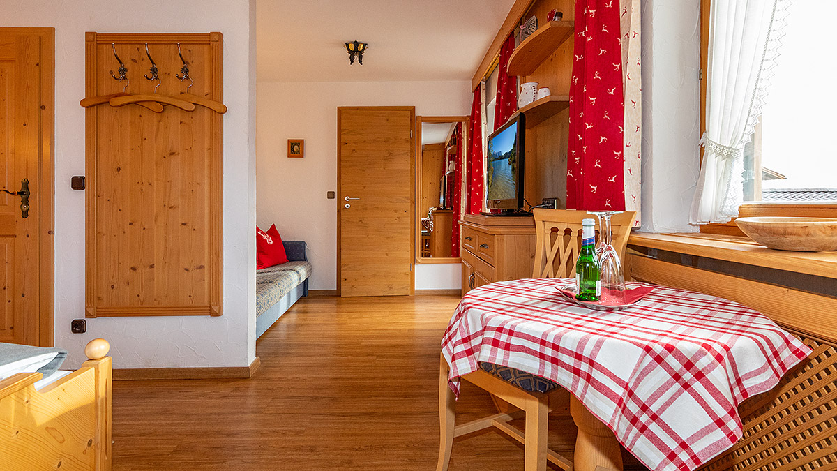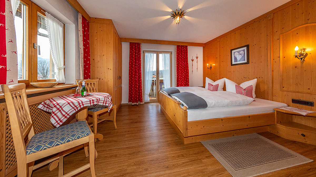Es ist ausgestattet mit einem möblierten Süd/Ostbalkon (Blick auf Karwendel-und Wettersteingebirge mit Zugspitzmassiv), Sitzgruppe, Couch (ausziehbar), DU/WC, Fön, Kabel-Flachbild-TV, Radio/CD, Safe, Wasserkocher und kostenlosem WLAN.